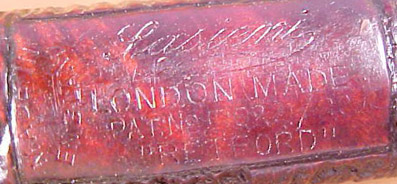 On notera d'abord la marque sur la Bruyère avec la boucle caractéristique qui continue le "i" final, détail qui disparaîtra après 1946 quand Alfred Sasieni succèdera au fondateur de la marque. La présence d'un numéro de brevet (Pat N°...) confirme le fait que cette pipe est antérieure a 1946. A partir de 1935, des noms de villes anglaises (ici "Retford") ont été associés aux différents modèles. Autrement dit, cette pipe a été produite entre 1935 et 1946.
