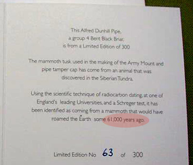 On voit bien que Dunhill exacerbe ce désir : la plaquette explicative qui accompagne la pipe de cet article insiste sur l'âge canonique de l'animal à grands renforts d'arguments scientifiques.