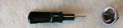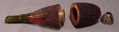 Le démontage complet de la pipe montre que le tuyau en ébonite est doté d'un système de condensation réduit ici à sa plus simple expression : une petite canule en aluminium. Notons que ces systèmes n'amènent pas de grands avantages pour le fumage, bien au contraire.