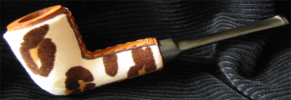 Il s'agit, bien sûr, de bois de bruyère. L'habillage est en léopard (Panthera pardus). L'animal aurait succombé sous la poigne de Tarzan en personne après un combat acharné. L'homme n'en est sorti vivant que parce que sa motivation à fumer une pipe gainée de peau était la plus forte.