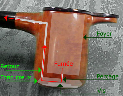 Evidemment il ne s'agit pas d'une pipe classique avec un fourneau à la base duquel partirait un conduit de fumée traversant tige et tuyau. Ce serait trop simple. Dans sa lancée notre savant fou décide d'une tige dont le départ est situé dans le haut de la tête de pipe. Quitte à innover, il ne va tout de même pas faire les choses à moitié.