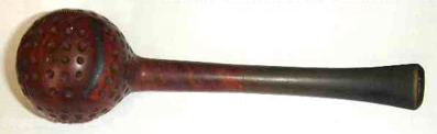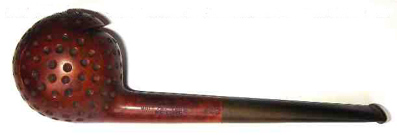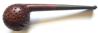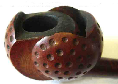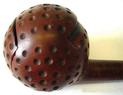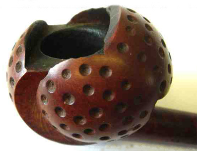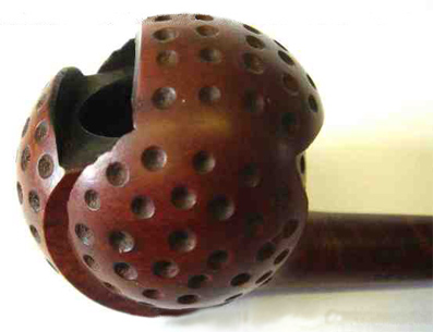 On trouve assez facilement des pipes en écume de mer avec une tête ronde parsemée de dépressions à la manière des balles de golf. C'est beaucoup plus rare pour les pipes en bois de Bruyère. Alors lorsqu'en plus on a une véritable petite boule et ce mécanisme original, vous vous doutez bien que les acheteurs se bousculent au portillon et le prix de la belle devient abracadabrant pour ne pas dire rédhibitoire.